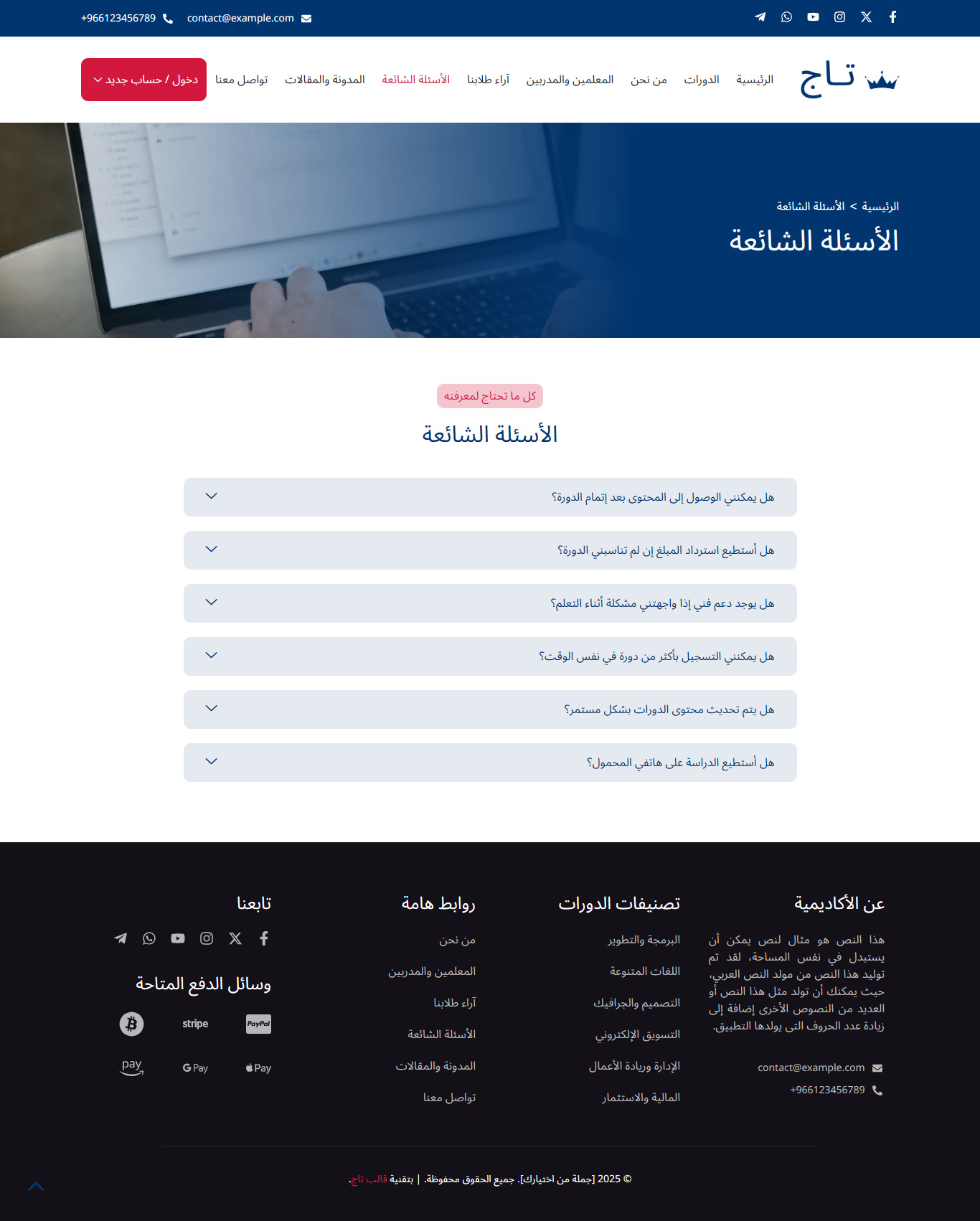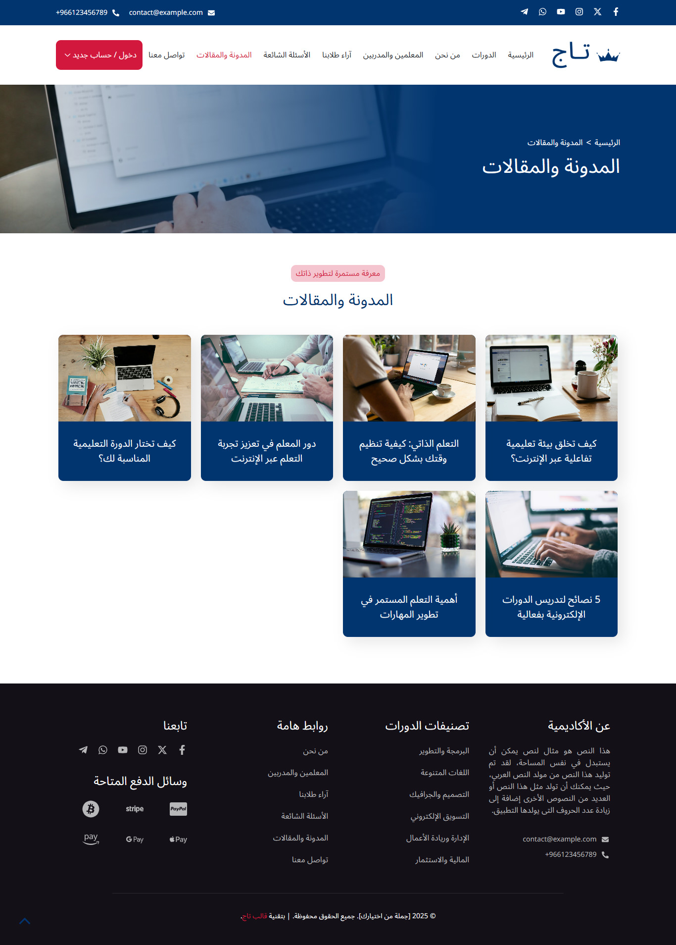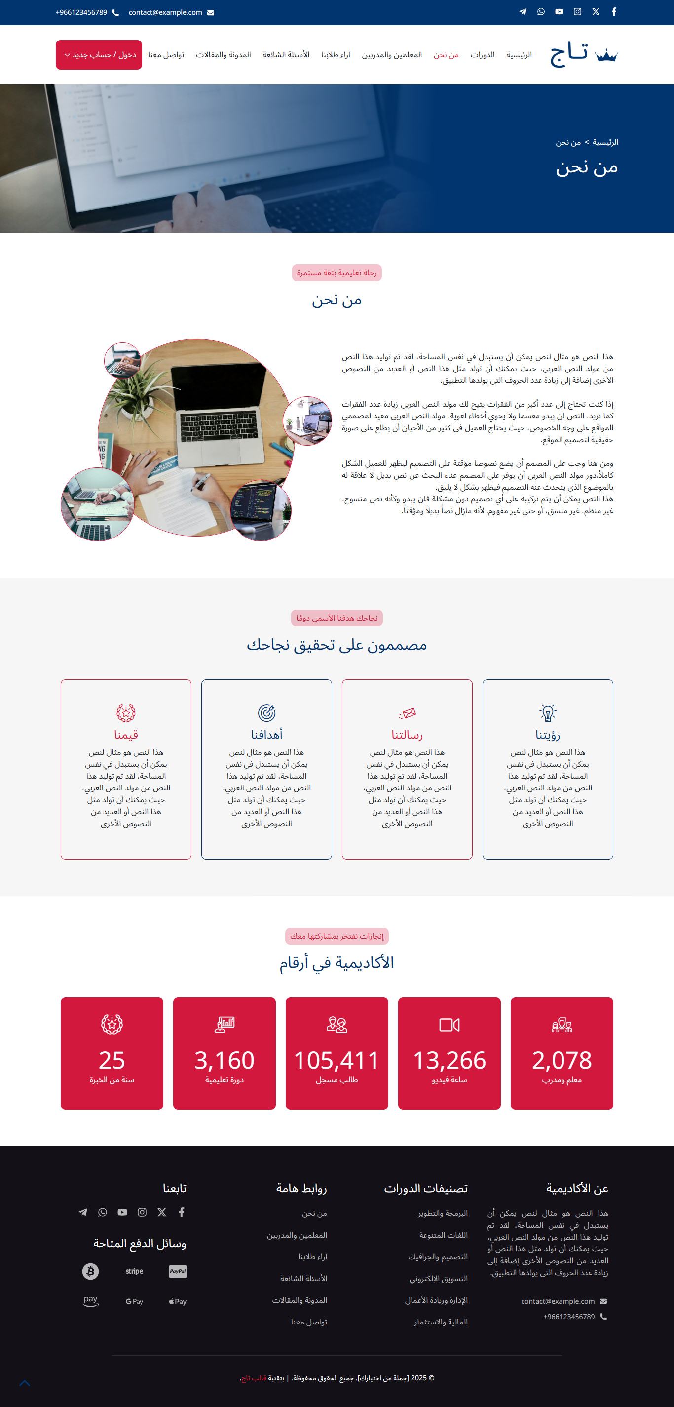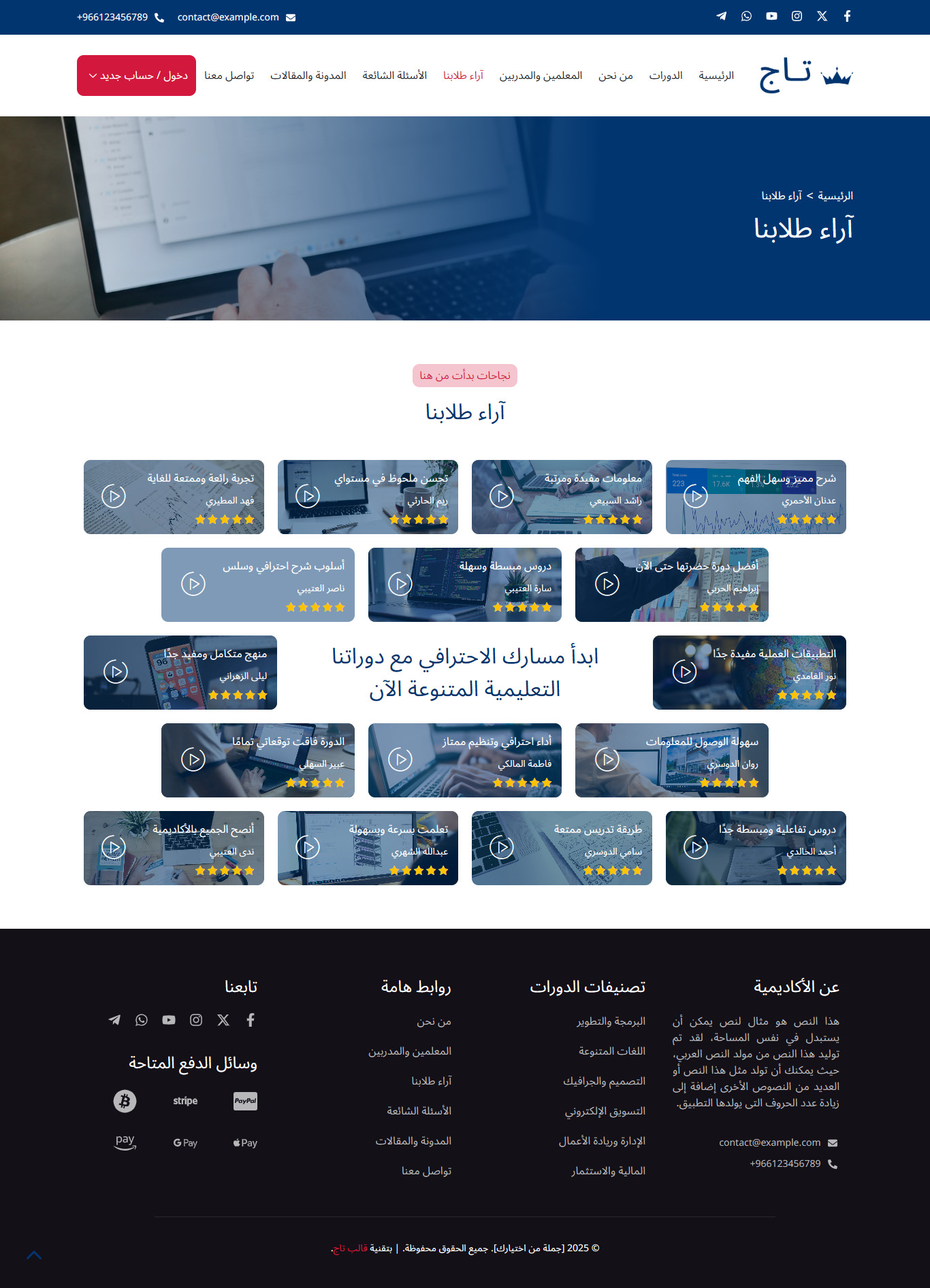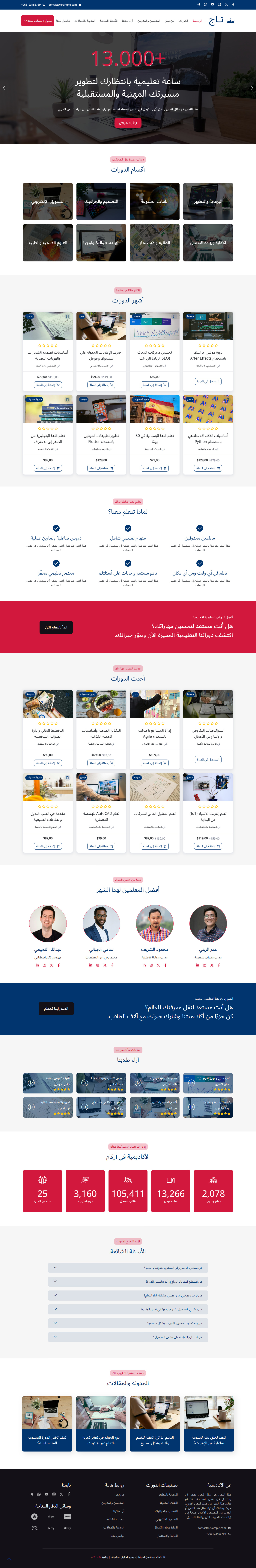 قالب تاج هو قالب ووردبريس عربي احترافي متطور يساعدك من خلال نماذج حديثة ومميزة في بناء مواقع تعليمية متكاملة بسهولة، مثل منصات الدورات التدريبية والكورسات، ونظام الاختبارات، ومواقع المعاهد والمدارس والأكاديميات، مع واجهة استخدام سلسة وجذابة.