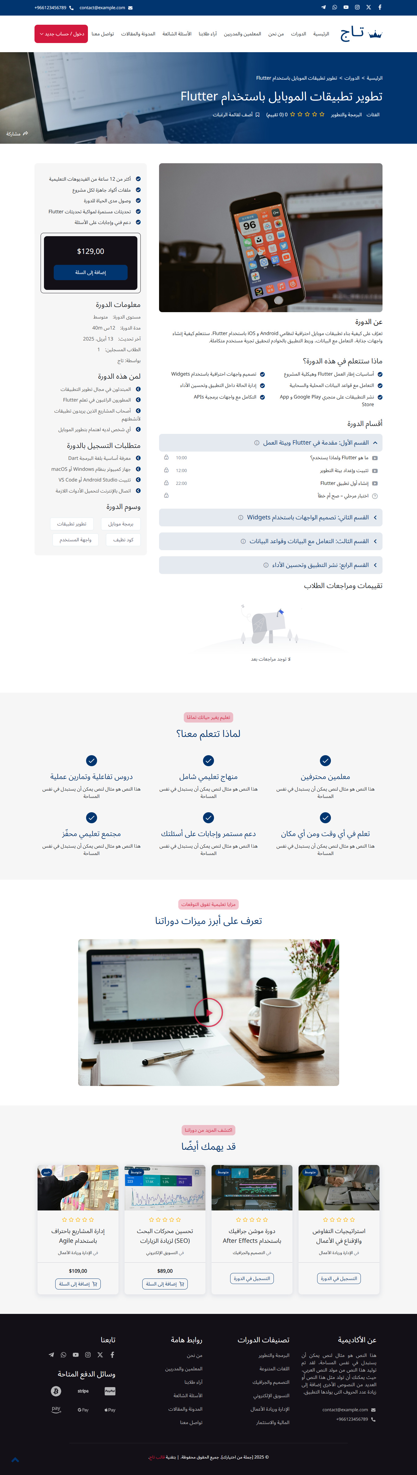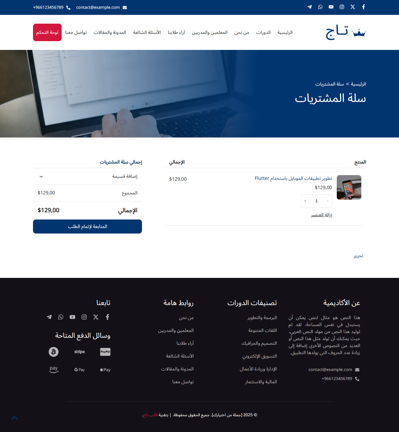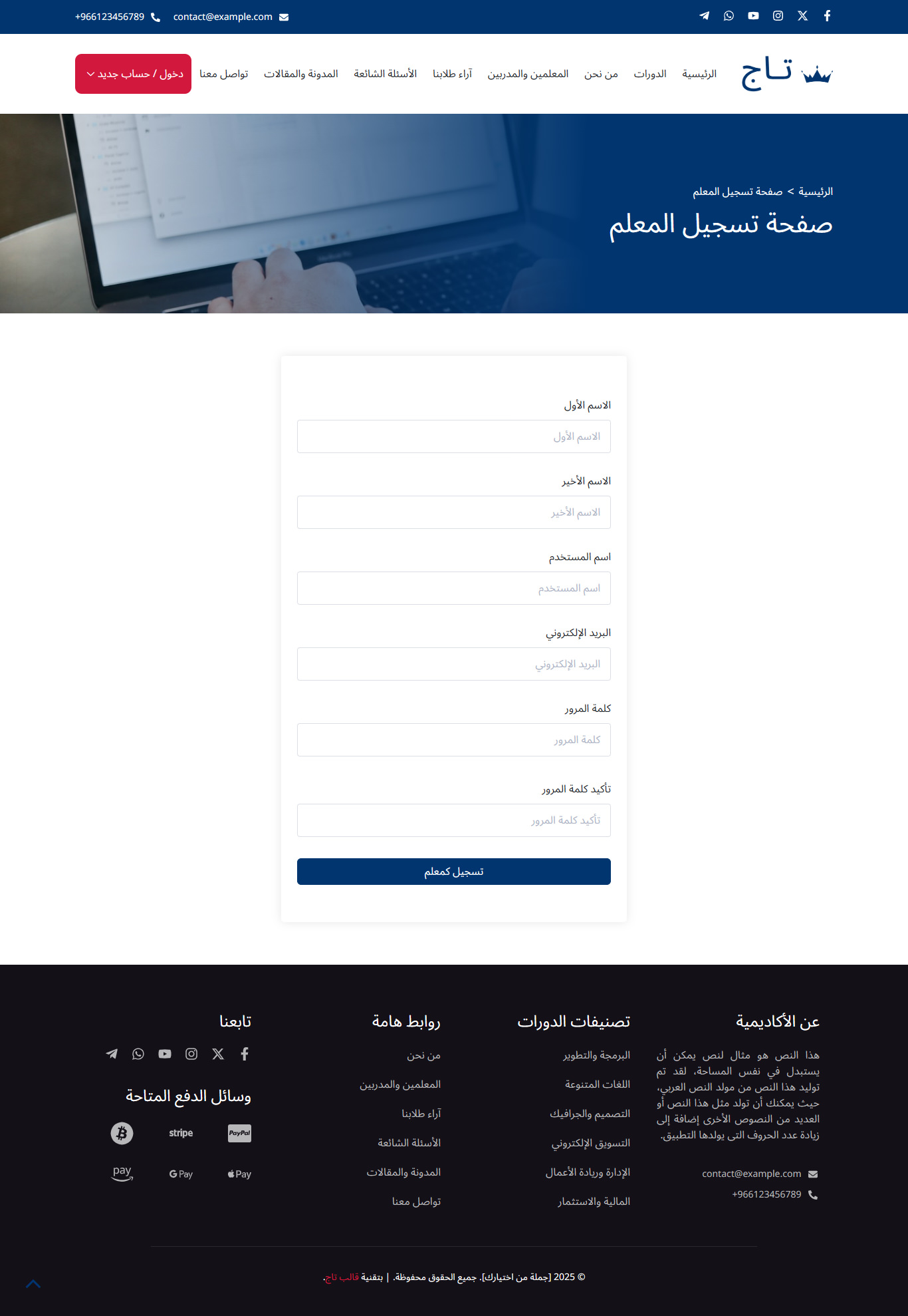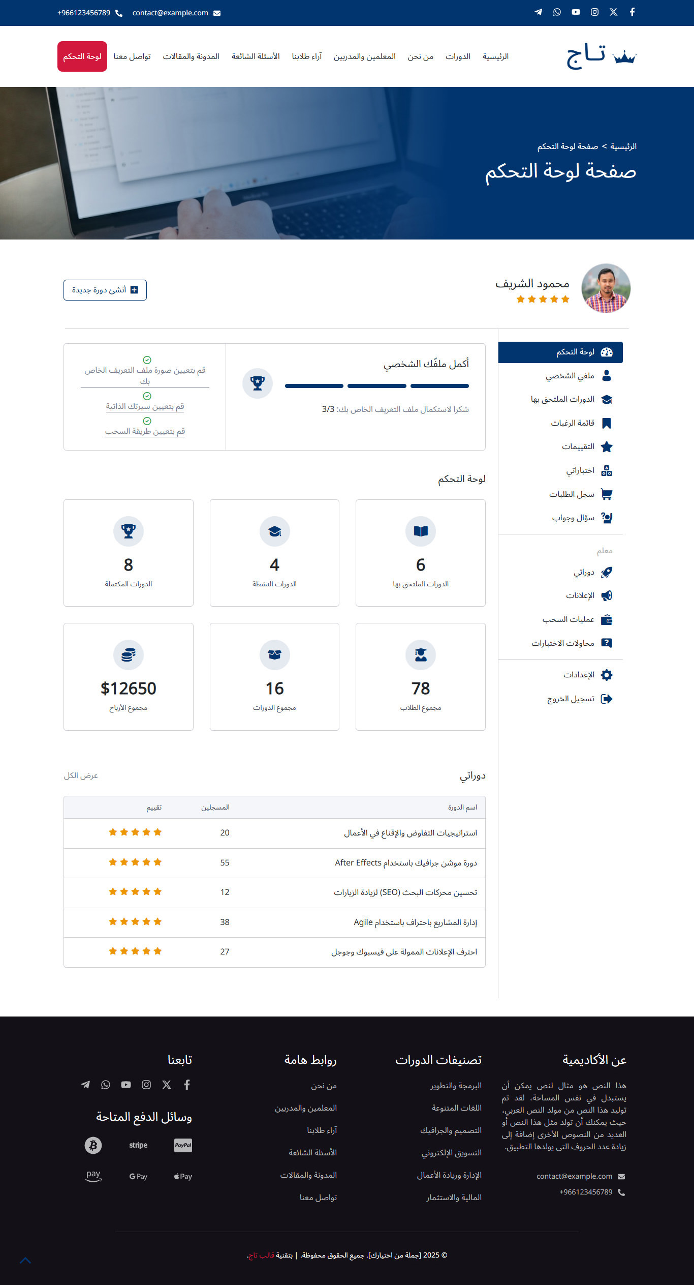 قالب تاج هو قالب ووردبريس عربي احترافي متطور يساعدك من خلال نماذج حديثة ومميزة في بناء مواقع تعليمية متكاملة بسهولة، مثل منصات الدورات التدريبية والكورسات، ونظام الاختبارات، ومواقع المعاهد والمدارس والأكاديميات، مع واجهة استخدام سلسة وجذابة.