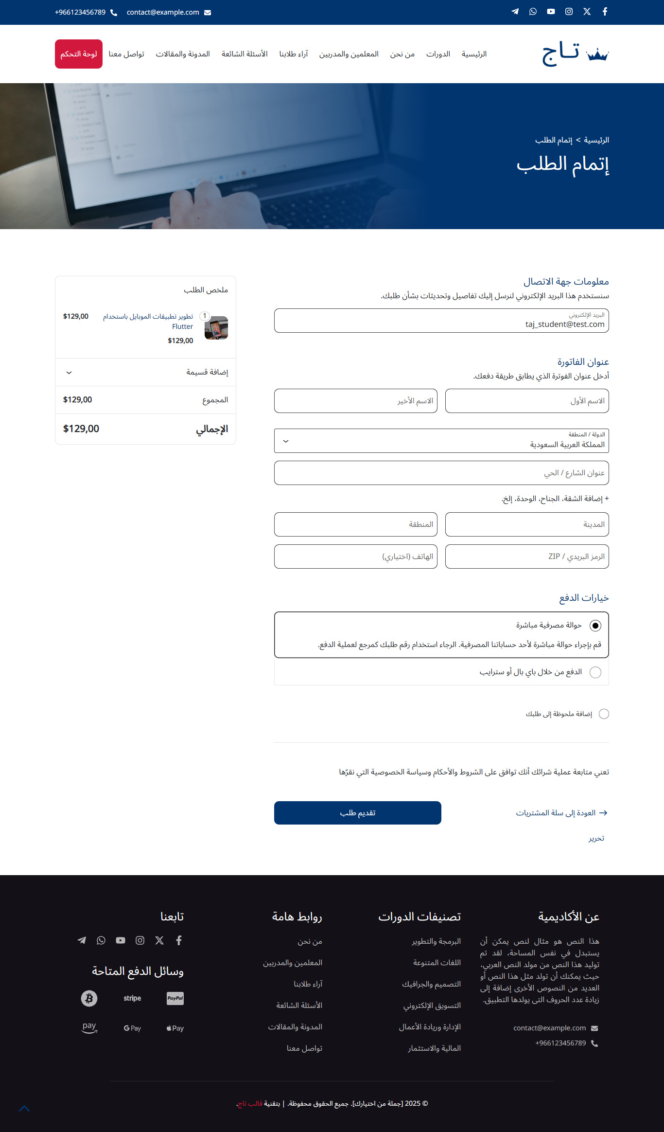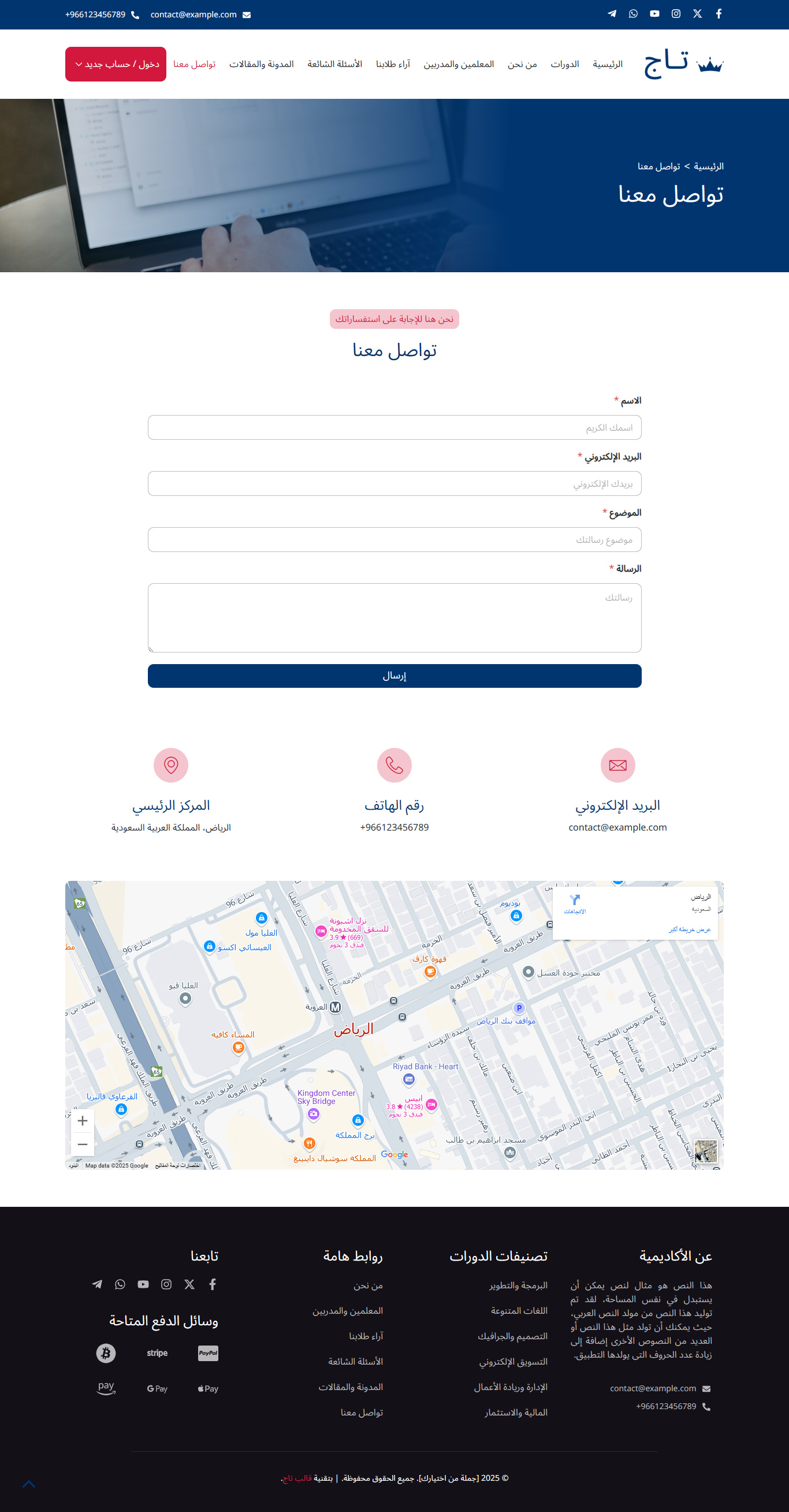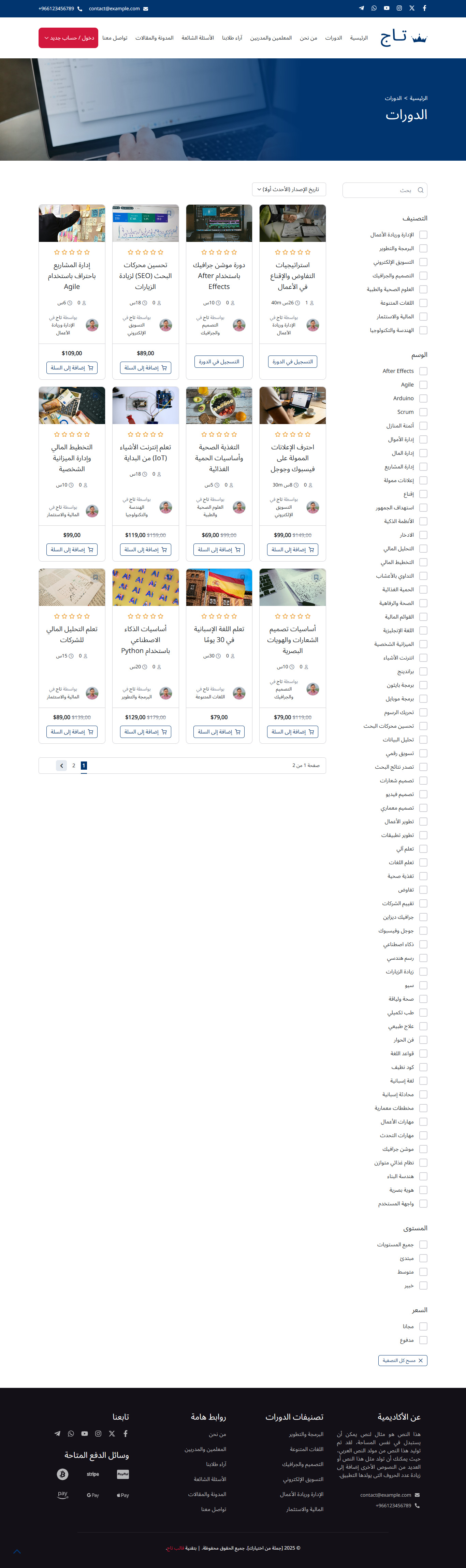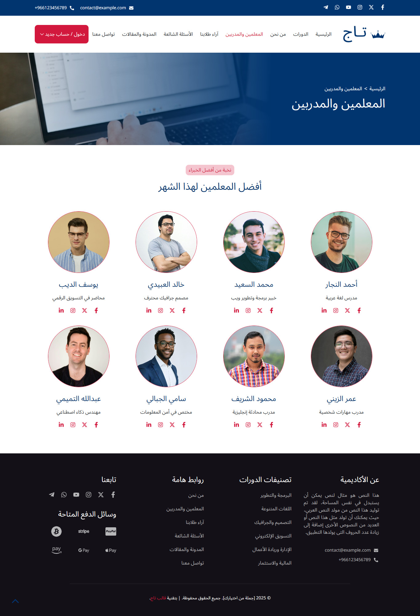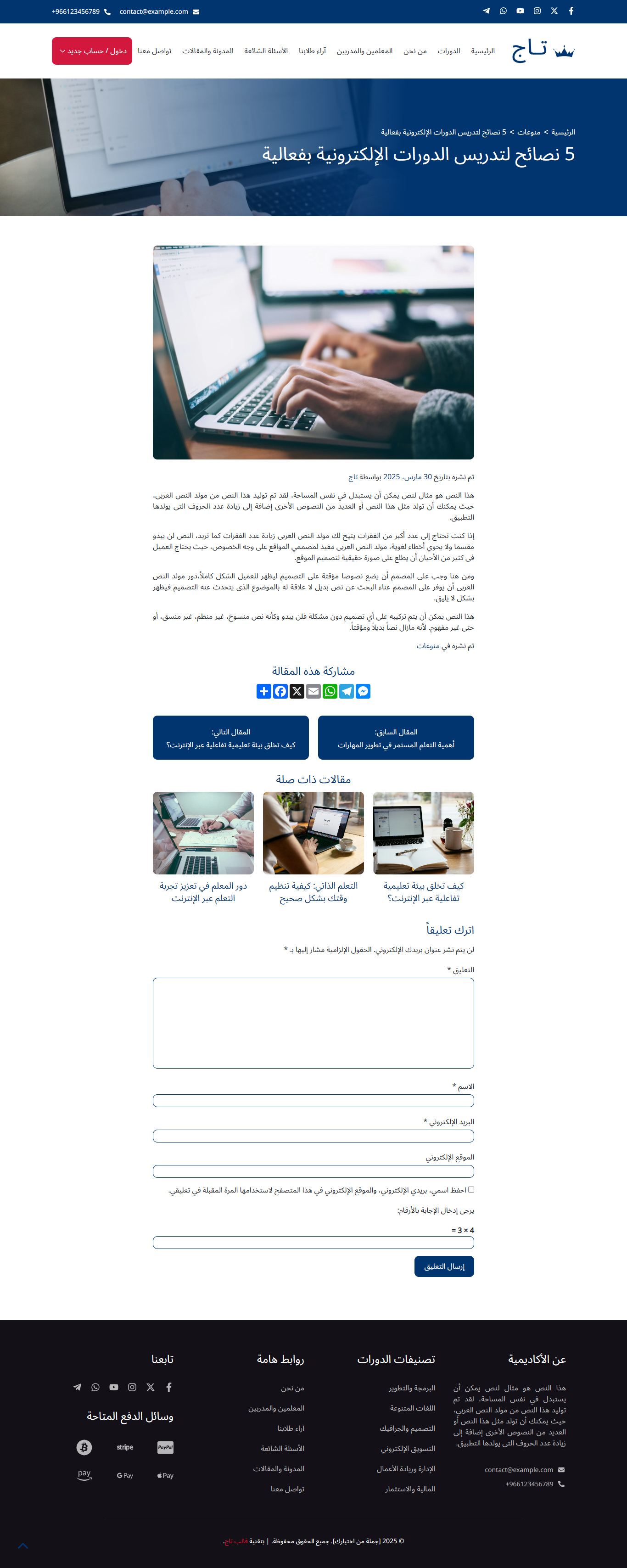 قالب تاج هو قالب ووردبريس عربي احترافي متطور يساعدك من خلال نماذج حديثة ومميزة في بناء مواقع تعليمية متكاملة بسهولة، مثل منصات الدورات التدريبية والكورسات، ونظام الاختبارات، ومواقع المعاهد والمدارس والأكاديميات، مع واجهة استخدام سلسة وجذابة.